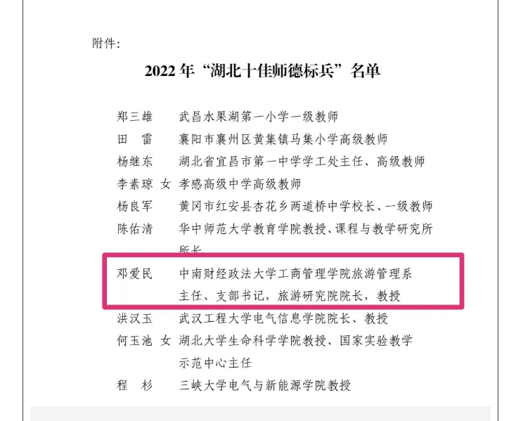 新闻网讯(通讯员 尤军)近日,湖北省教科文卫体工会发布了《关于2022年“湖北十佳师德标兵”“湖北师德先进个人”培育结果的通报》,我校工商管理学院邓爱民教授获得“湖北十佳师德标兵”荣誉称号。