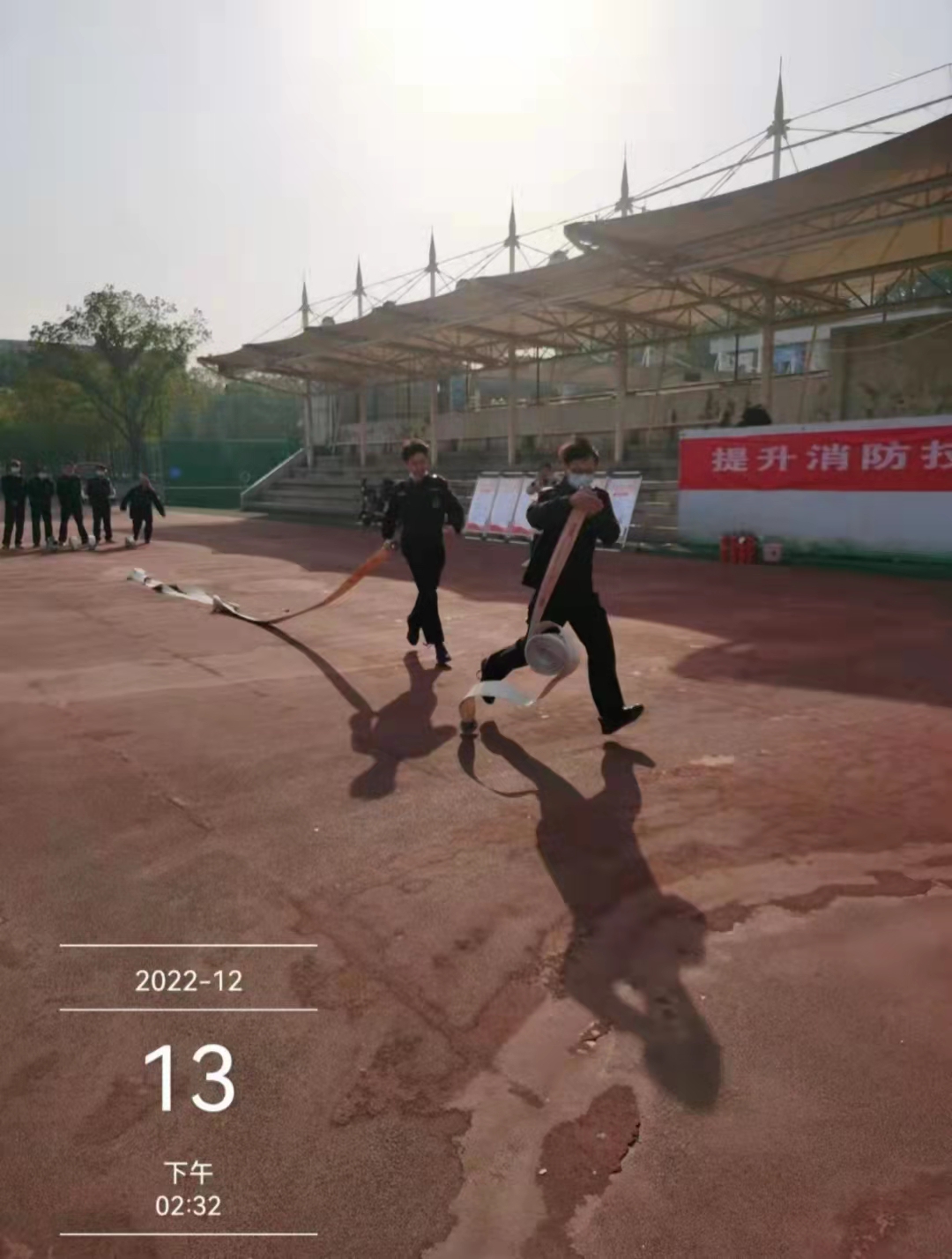 随着一声令下,比武正式开始。参赛队员们分秒必争,一人两盘水带连接、出枪、灭火,动作一气呵成。在灭火器实操竞赛环节,参赛队员飞速跑向手提4KG干粉灭火器处,再快速跑向着火点灭火。全程配合协调默契,展现出平时训练的“真功夫”,高标准地完成了全部比武项目。
