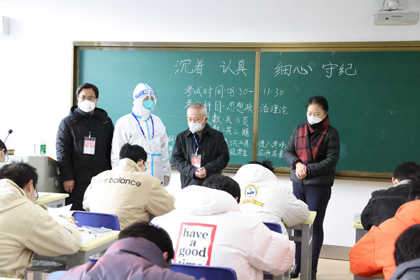 校领导高度重视硕士研究生入学考试。12月24日一早,校党委副书记、校长杨灿明,校党委副书记、纪委书记侯振发,校党委常委、副校长姚莉在考点工作和防疫工作领导小组有关负责人陪同下巡察考场情况,看望考生并慰问考务工作人员。校领导一行依次来到南湖校区的文泰楼、文澴楼、文添楼、文澜楼等考区检查考务工作,重点查看考生入场核验检查卡口、考点指挥中心以及普通考场、特殊考场和应急处置考场,强调要全面贯彻上级决策部署和相关要求,多措并举,高效统筹做好疫情防控和考试组织工作,关心关爱广大考生和考务工作人员,全力确保研考平稳顺利完成。每到一处,校领导都关切地询问考务人员的身体状况,并叮嘱大家在做好考试服务工作的同时要做好个人防护,确保身体健康。党办校办、纪委办公室、研究生院、党委研究生工作部、保卫部、信息管理部、后勤保障部、校医院等有关部门负责人在考点现场组织考务工作。