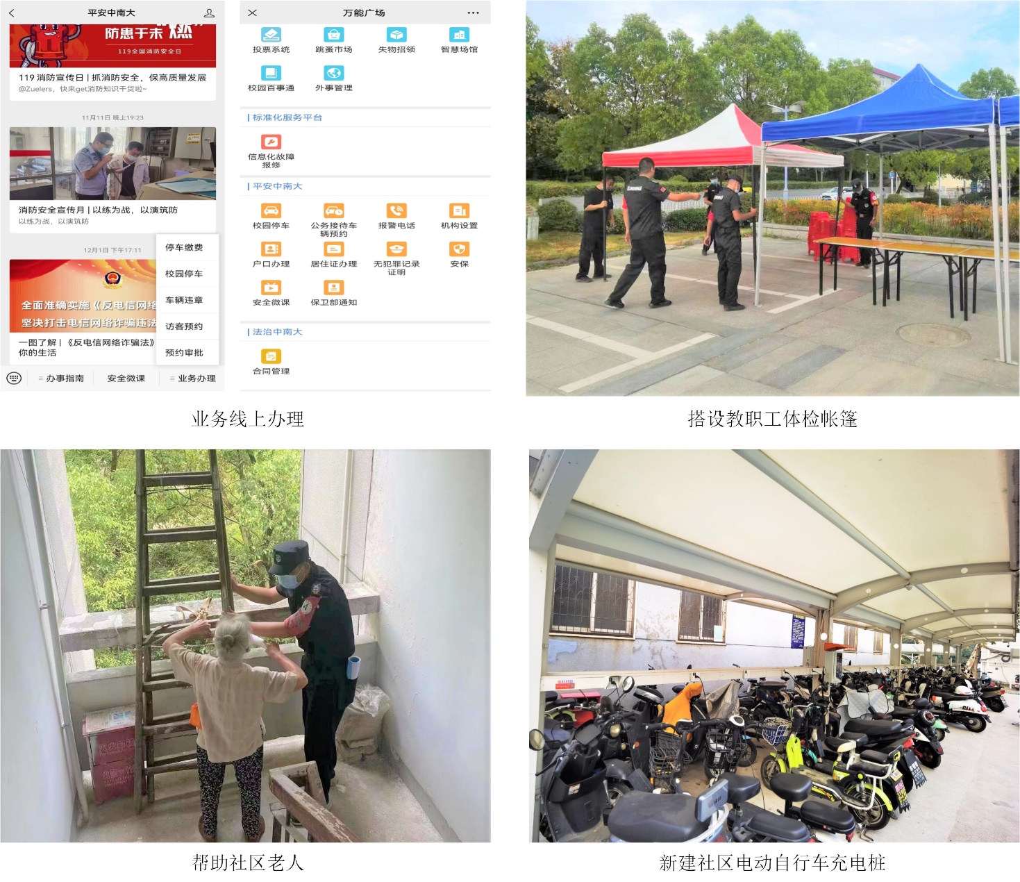 “为师生居民做好服务”一直是保卫部的首要任务之一,积极做好车辆入校审批、户籍管理、居住证办理、无犯罪记录证明办理等工作。加强与公安机关、各学院沟通,引导师生规范使用户籍卡,指导师生办理护照、出入境证照;为进一步方便师生,提高办事效率,专门在平安中南大微信公众号、企业微信平安中南大开通部分业务线上办理。南湖、首义社区始终把社区居民放在首位,急群众之所急、想群众之所想、帮群众之所困,用好政府投资改造资金,切实改善居民生活环境。近年来,积极推进党群服务驿站、新时代文明实践站、社区老年人服务中心建设等多项工作,为社区居民新建非机动车停车棚,安装电动自行车充电桩,有效解决居民充电难的问题,社区居民幸福感不断提升。