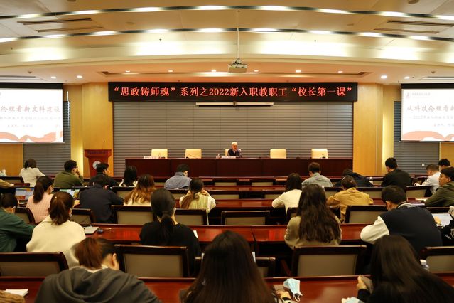 新闻网讯(通讯员 吴佳欣 摄影 李赢) 3月15日上午,校党委副书记、校长杨灿明在中原楼七楼会议室为2022年新入职教职工讲授入职第一课。“校长第一课”是学校“思政铸师魂”系列课程之一,100余名新入职教职工参加学习。
