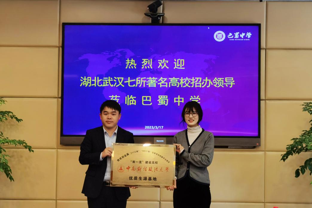 新闻网讯(通讯员 王秋菊)为顺应高考改革,主动对接生源高中,精准服务考生,3月17日至18日,米兰电竞·(中国区)等武汉七所部属高校组成名校联盟共同前往重庆市巴蜀中学、西南大学附属中学(以下简称“西大附中”)开展2023年本科招生宣传暨优秀生源基地授牌仪式。
