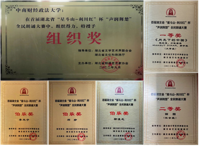新闻网迅(通讯员 柳凌之)3月25日,首届湖北省“声润荆楚”全民朗诵大赛颁奖典礼暨“开启新征程 奋进新时代”朗诵音乐会在珞珈山剧院隆重举行,我校参赛队伍喜获佳绩。经专家评审,我校被授予优秀组织奖,李木子、邓珍、柳凌之3位老师获伯乐奖,新闻与文化传播学院田园老师朗诵的作品《母亲是一种岁月》获社会组二等奖,国际教育学院鲍菘涛、方陈樱琪、MAKSUT DINAR、郭宇航朗诵的作品《月光下的中国》获大学生组一等奖。