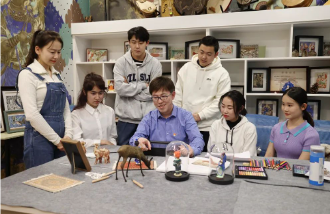 在“美美窟艺”中华西域石窟艺术传承中心与学生共赏手工艺品