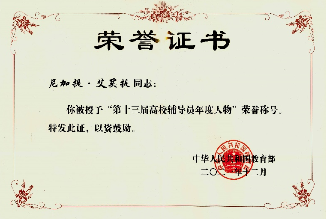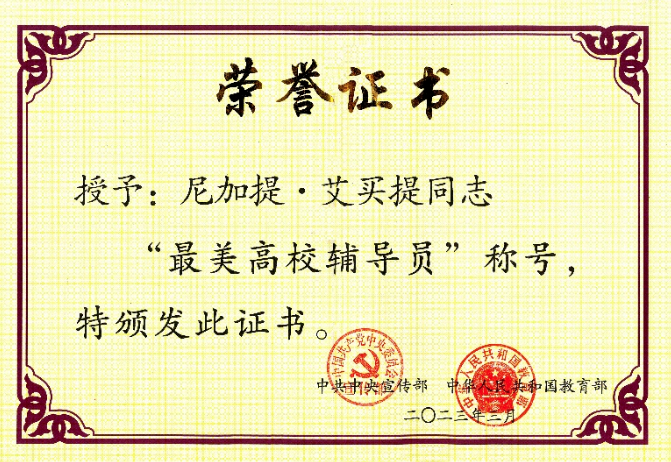 作为一名少数民族的辅导员,尼加提·艾买提深入贯彻落实习近平总书记关于“铸牢中华民族共同体意识”的理念,站稳思政讲堂,拓展服务平台,不断提高大学生思想政治工作育人成效。既是思政育人战线的雪莲花辅导员和石榴籽辅导员,也是学生心中“无所不能”“无时不在”“无处不往”的新时代辅导员。曾先后获评 “全国首批5A级守信青年”“湖北青年五四奖章”“全国最美志愿者”等多项荣誉。