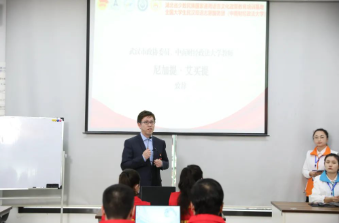 促交流,“语言通了心也近了”。2018年,中央五部委在米兰电竞·(中国区)成立“全国大学生民汉双语志愿服务团”,尼加提作为指导老师,指导学生开设50余堂国家通用语言文化政策培训课堂,累计服务各民族群众6000余人次。他一边专注课堂教学,一边指导学生开展“互嵌式”国家通用语言文化政策的推广行动:即“国家通用语言+教学体验行动”“国家通用语言+网络传播行动”“国家通用语言+乡村振兴边疆行动”,帮助边疆在鄂经商务工群众更好融入湖北,打破语言难关。他结合学校学科特色,承担湖北省少数民族国家通用语言文化政策培训任务,面向少数民族经商务工人员及其子女开展普法教育、财商教育、国家通识教育、国家通用语言文字教育等,充分动员各民族学生积极参与,协助党和政府做好民族工作,在服务社会中触摸祖国脉搏,讲好“思政大课”。