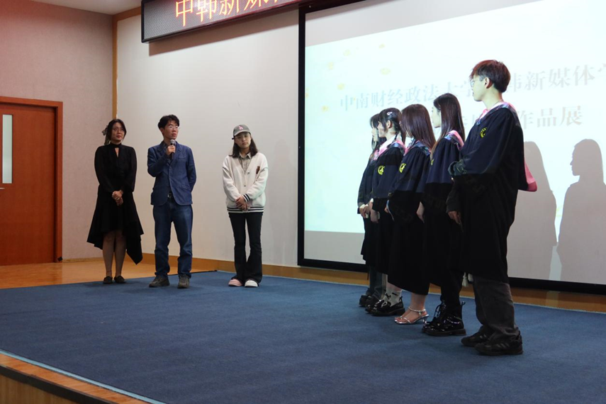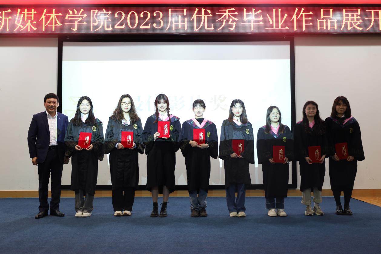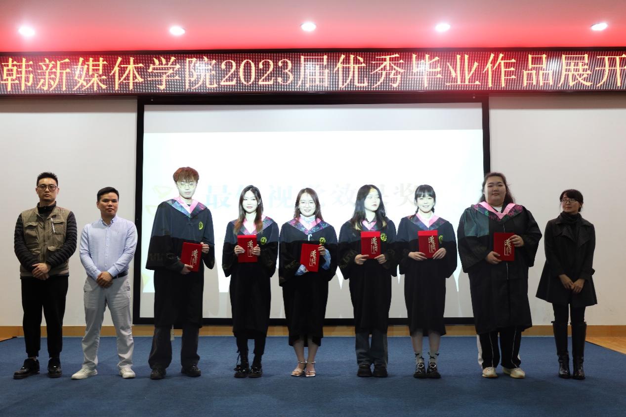 中韩新媒体学院党委书记祝振炎,为获“影像类优秀作品奖”的同学颁发获奖证书。