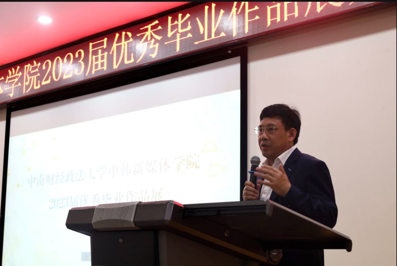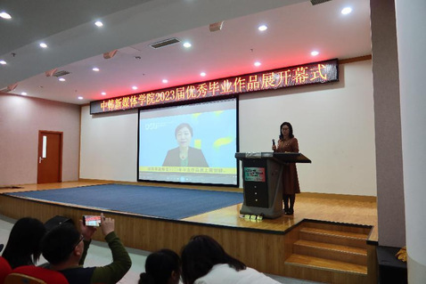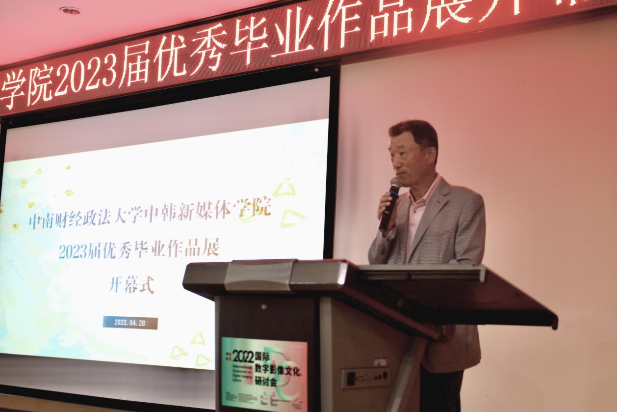 刘仁山在致辞中,围绕党的二十大所提出的科技、教育、人才“三位一体”统筹安排,勉励中韩学子们要以更高的标准自我要求,坚守在艺术创作的岗位上,创作优秀文艺作品。对于学院师生在中国国际“互联网+”“挑战杯”等大学生创新创业竞赛中屡获佳绩的办学成果做出肯定,并表示优秀毕业作品展正是学院本科教学改革的集中体现,也是我校融通办学理念的实践成果。最后祝福同学们,“作为未来的文艺工作者,愿你们一直发现真、弘扬善、传递美。用青春的力量拥抱时代,用青年人的智慧与勇气,在数字技术的时代自由翱翔。”