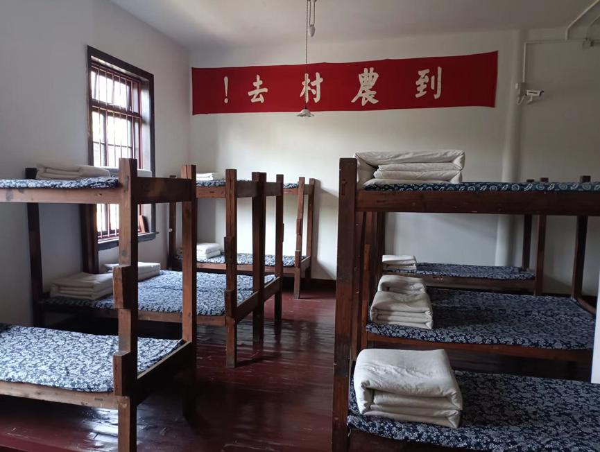 “星火训练营”营员、志愿者解说员夏双莲讲解道:“《农讲所规约》中提到,要把革命继续发展下去,就必须把军事训练放在相当重要的位置,如果没有把它放在相当重要的位置,那就是革命没有彻底。”农讲所设有军事教育委员会,所有学生都是军事编制,实行军事化管理。学生宿舍中放有枪架,每名学生都领有79式步枪、军装以及农作用具,宿舍上悬挂书有“到农村去”字样的横幅,反映了大革命时期农民运动轰轰烈烈的发展状况。