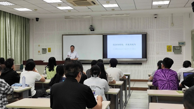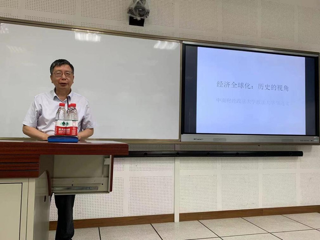 新闻网讯(通讯员 李喆)为继续推进学习贯彻习近平新时代中国特色社会主义思想主题教育走深走实,进一步深化思想政治理论课改革创新,切实推进二十大精神进教材、进课堂、进头脑,6月7日上午,副校长邹进文教授在文波楼语音210教室与外国语学院师生同上一堂思政课,为外国语学院30余名学生党员、本科生入党积极分子进行题为《经济全球化:历史的视角》的专题授课,外国语学院院长蔡圣勤、党委书记陈亚奇、副院长袁奇,教务部副部长邓松,马克思主义学院石敬琳老师等与会学习。