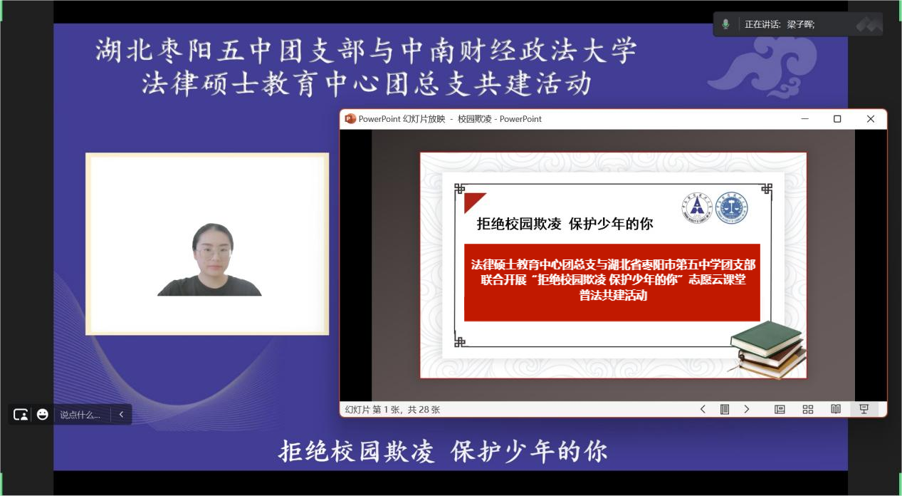 新闻网讯(通讯员 余安琪 马晨娇 学生通讯员 代诗涵 黄丹阳)为深入学习宣传贯彻党的二十大精神,着力推进社会主义法治文化建设,增强法治宣传教育的针对性和实效性,6月9日上午,法律硕士教育中心于文澴楼314教室为湖北省枣阳市第五中学学生开展以“拒绝校园欺凌 保护少年的你”为主题的志愿云课堂普法活动。法律硕士教育中心辅导员余安琪、马晨娇,湖北省枣阳市第五中学团支部书记罗俊峰参加本次活动。