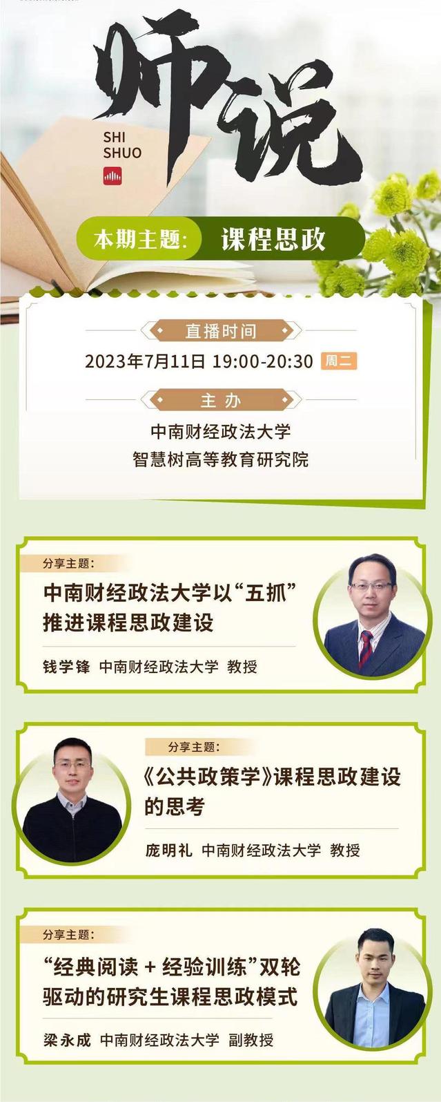 随后,国家级课程思政示范课程《公共政策学》负责人庞明礼教授就如何在专业课中融入思政作详细介绍,从教学设计、章节布置及授课技巧等多个环节进行经验分享,用自身的教学案例深入解读了《高等学校课程思政建设指导纲要》的核心要求。《当代中国法制》课程组梁永成副教授着重介绍了“经典阅读+经验训练”研究生思政教育模式,分享了该模式的背景、特色及相关成效,两位教师的分享受到了广泛的好评。