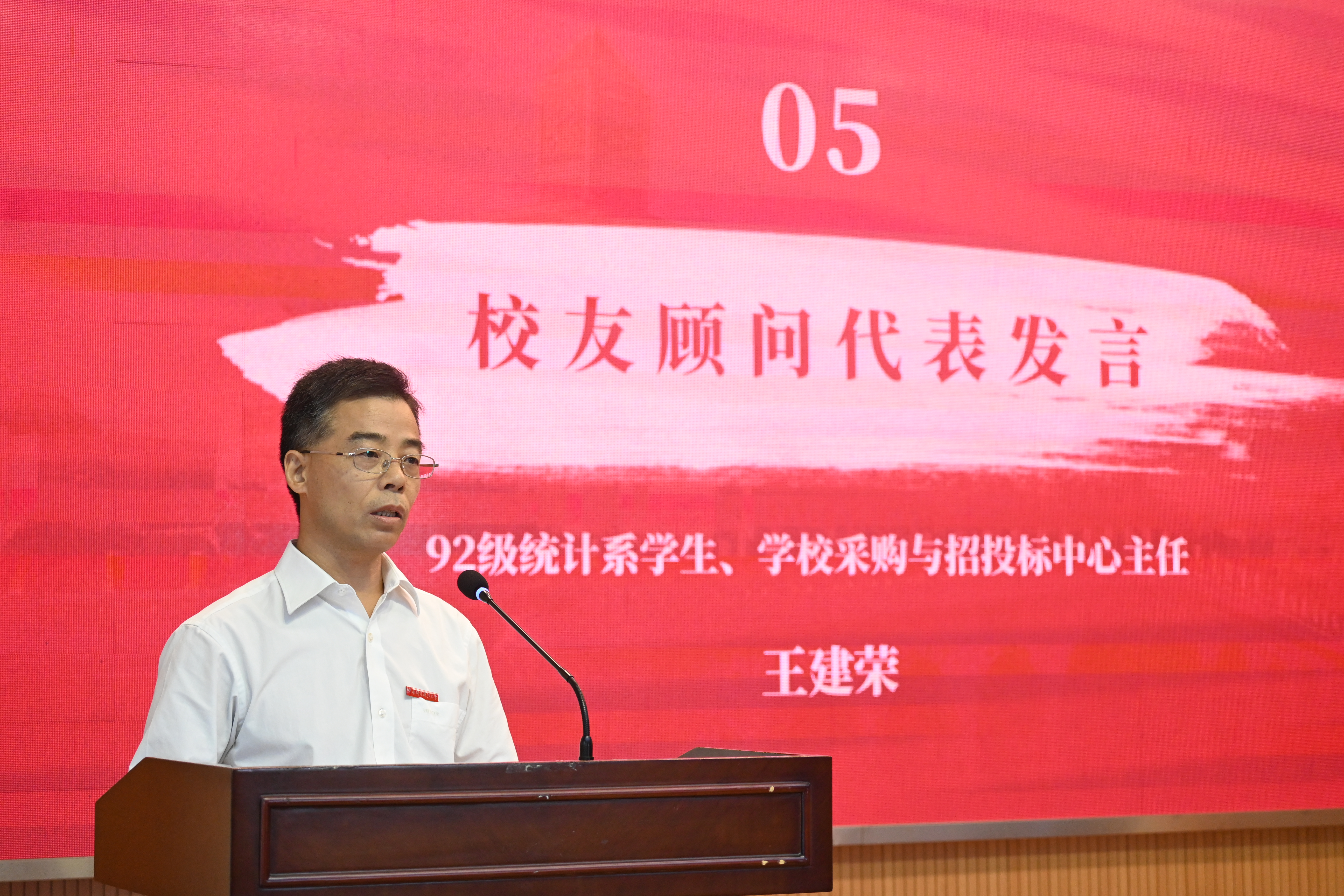 最后,校友顾问代表、92级统计系学生、学校采购与招投标中心主任王建荣发言。回忆起四年求学时光,他犹记得老师们的关怀。学院工作二十余载,他关注学院发展,讲好学院故事,为学院工作贡献自己的力量。他表示,校友顾问既是一份荣誉也是一份责任,往后将充分发挥联络校友、服务校友的积极作用,为校友排忧解难、答疑解惑,常怀感恩之心,传承学院校友精神。