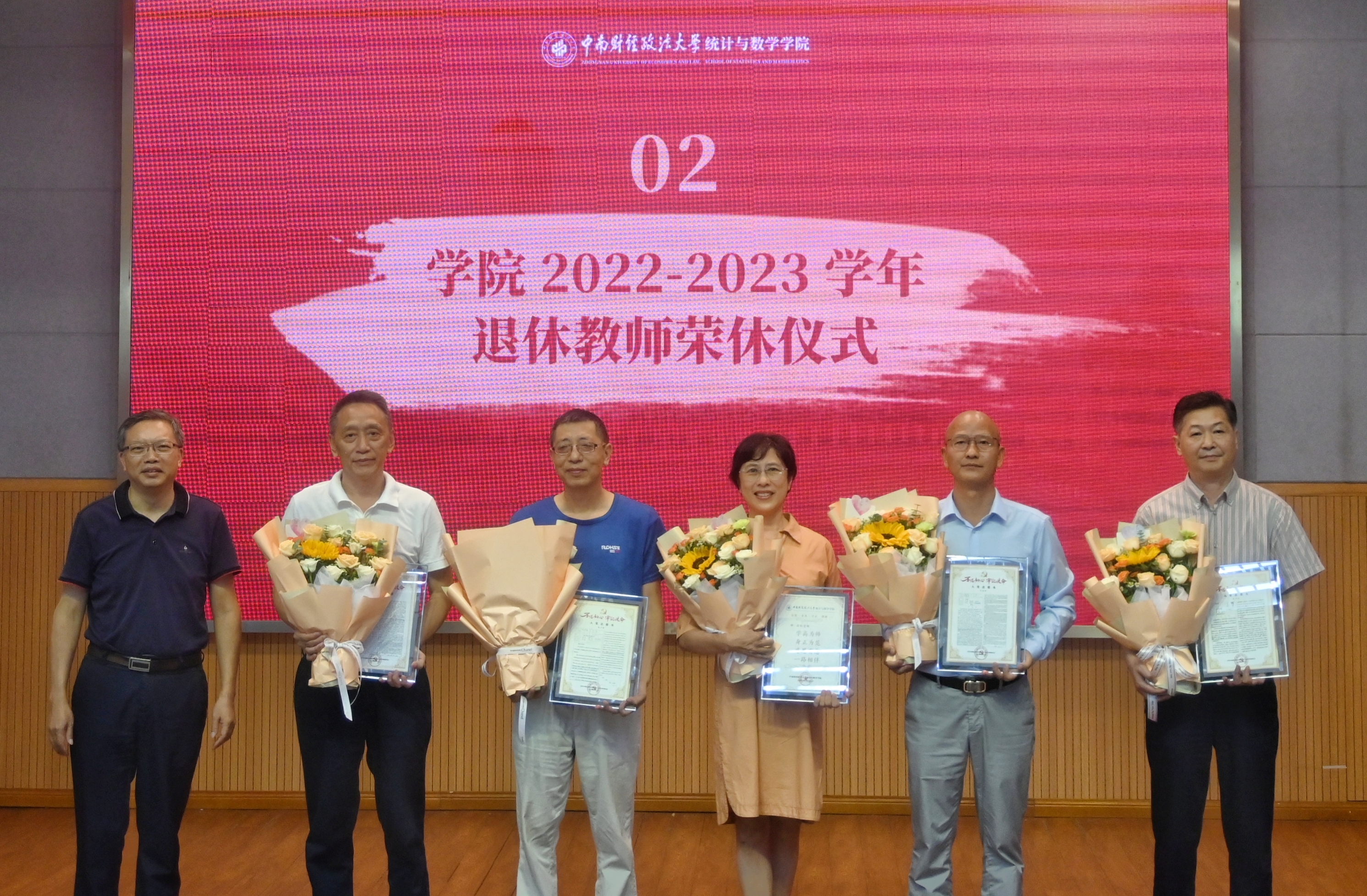 自去年9月至今年8月,学院共有七位老师荣休。统计系系主任肖磊、数理与金融统计学系系主任蒋锋、大数中心主任熊波、学办陈盈分别回顾了七位荣休教师的光荣事迹。他们勤恳敬业、任劳任怨,用扎实的学识和仁爱之心教育引导学生,用行动深刻诠释了人民教师的奉献与担当。仪式第二项议程,由校党委常委、副校长覃红为荣休教师颁发纪念证书,2023年新入职教师向他们敬献鲜花。今年荣休的党员教师纪念证书是由他们的《入党志愿书》翻拍制作的,其他教师纪念证书则是根据同事和学生评价整理成的赠言留念。