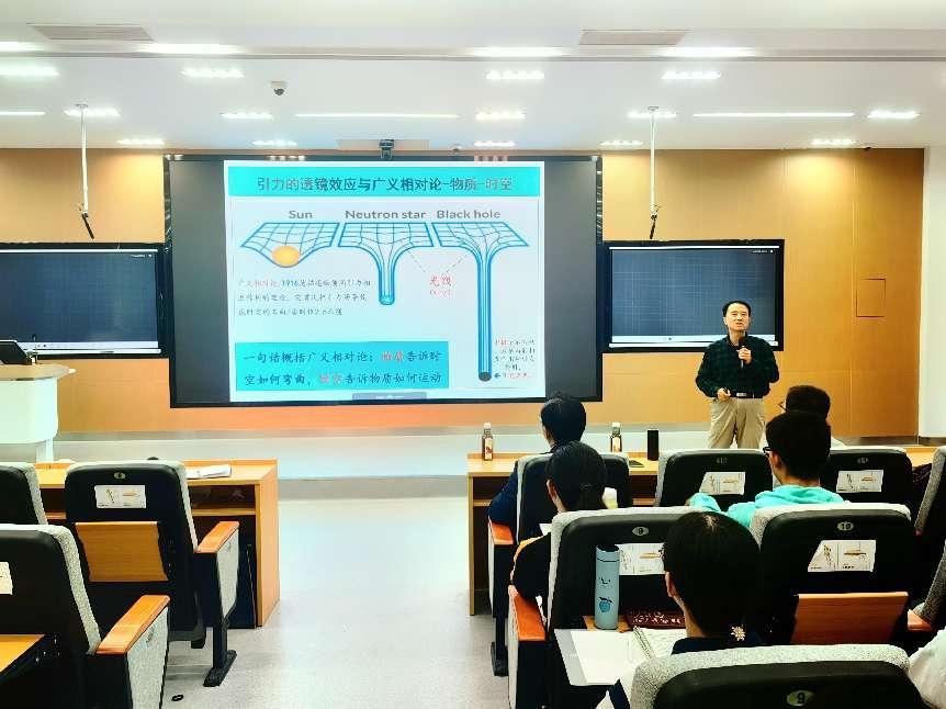 “你是谁?你从何而来?你将向何处去?”龚一鸣以三个问题开篇,对宇宙的起源与演化娓娓道来,引经据典向同学们讲授了什么是宇宙、从古至今对宇宙的定义,他图文并茂地讲解了宇宙的组成与结构,生动展现引力透镜效应与广义相对论。龚教授引用一句话概括广义相对论:物质告诉时空如何弯曲,时空告诉物质如何运动。随后,龚一鸣向同学们介绍了从大爆炸到宇宙的形成,他指出奇点通过大爆炸产生了物质和能量,物质和能量在时空形成了万物。在讲授太阳系的起源和演化时,龚一鸣讲述了银河系的演化,以及太阳系八大行星的大小、体态、运动、卫星,进而引出太阳系的组成和特征。通过借鉴康德-拉普拉斯星云说,他系统阐述了太阳系的起源与太阳的演化。课程最后,龚一鸣从地球的构成、相态与运动方面讲述地球的特征,通过详细讲解地质年代表,阐述地球的地质演化和天文演化过程。龚一鸣从人文的视角介绍人类世的由来和定义,强调警醒人类的自私、贪婪、索取和啃老地球要有节制,凸显了地质学的科学、社会、政治意义,并提出地球的未来和末日的问题,留给课堂无尽的思考。
