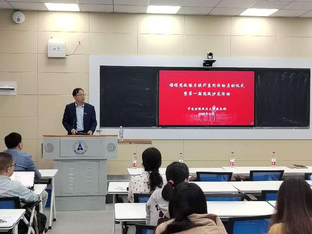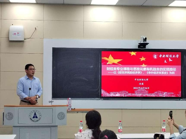 新闻网讯(学生通讯员 叶彦君 摄影 李晗)为全面贯彻全国高校思想政治工作会议精神,进一步做好课程思政建设,推动各类课程与思政课程同向同行,10月26日下午,课程思政能力提升系列活动启动仪式暨第一期思政沙龙于文波楼111智慧教室开展,中央财经大学经济学院副院长伏霖为我校经济学类专业课教师代表开展专题讲授,主题为“财经类专业课程与思政元素有机融合的实现路径”。