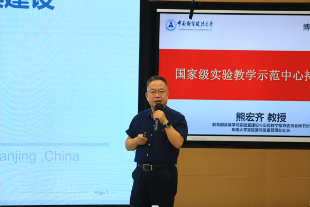 教育部高等学校实验室建设与实验教学指导委员会秘书长、东南大学实验室与设备管理处处长熊宏齐教授以“国家级实验教学示范中心持续建设”为题,介绍了东南大学在实验教学示范中心的人才培养理念、教学体系、深度融合等方面主要做法。