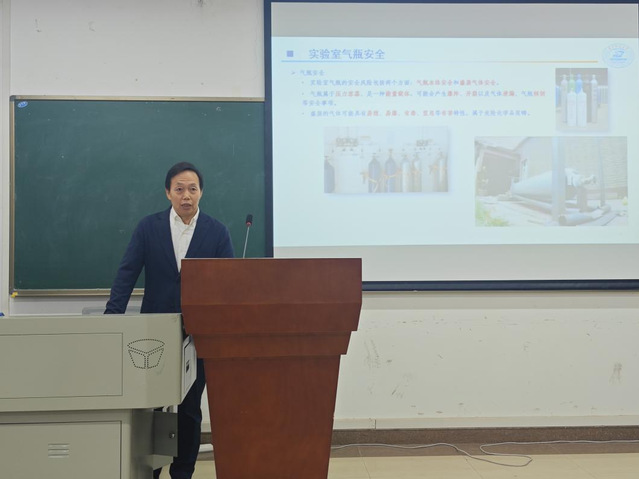 本次活动分两部分,第一部分是实验室安全培训讲座。华中科技大学实验室与设备管理处处长助理冯志力结合近几年高校实验室安全事故的真实案例,深入讲解实验室的常见风险,向与会人员普及实验室个体防护知识。