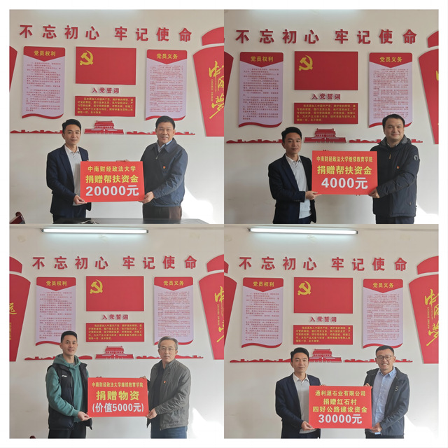 此行,刘仁山代表学校捐赠帮扶资金20000元;继教学院捐赠帮扶资金4000元、捐赠帮扶物资价值5000元;通利源石业有限公司捐赠红石村四好公路建设资金30000元。