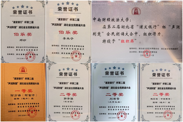 新闻网讯(通讯员 柳凌之)11月27日,由湖北省文学艺术界联合会、湖北省文化和旅游厅联合指导,湖北省朗诵艺术家协会主办的全民性、公益性全省朗诵赛事第二届“声润荆楚”全民朗诵大会圆满落幕,我校斩获多项奖项。学校在朗诵大会中获“组织奖”,国际教育学院李木子老师、邓珍老师获“伯乐奖”,李木子、邓珍指导的朗诵作品《我是长江里的一滴水》获得国际组一等奖,刑事司法学院郭泽强教授的诵读作品《岳飞》获社会组二等奖,法学院瞿玉杰老师、钟开炜老师指导的朗诵作品《在中国大地上报道》获大学生组二等奖,李木子、邓珍指导的朗诵作品《青春中国》获得国际(港澳台)组二等奖。