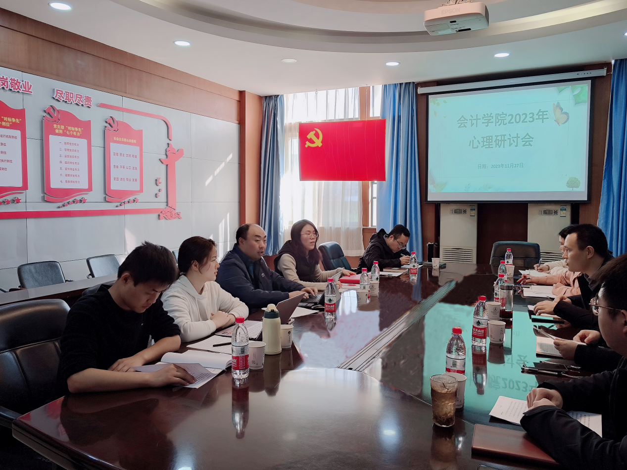 新闻网讯 (通讯员 黎玥 李紫萱)11月27日下午,会计学院2023年“润心育人,从‘心’启航”心理研讨会在文泉楼南306室召开。本次研讨会围绕主题“润心育人,从‘心’启航”展开,就会计学院心理健康教育工作的发展情况和学生心理状况典型案例等多方面内容进行探讨和广泛交流,对进一步促进会计学院心理健康教育工作的发展起到了积极作用。