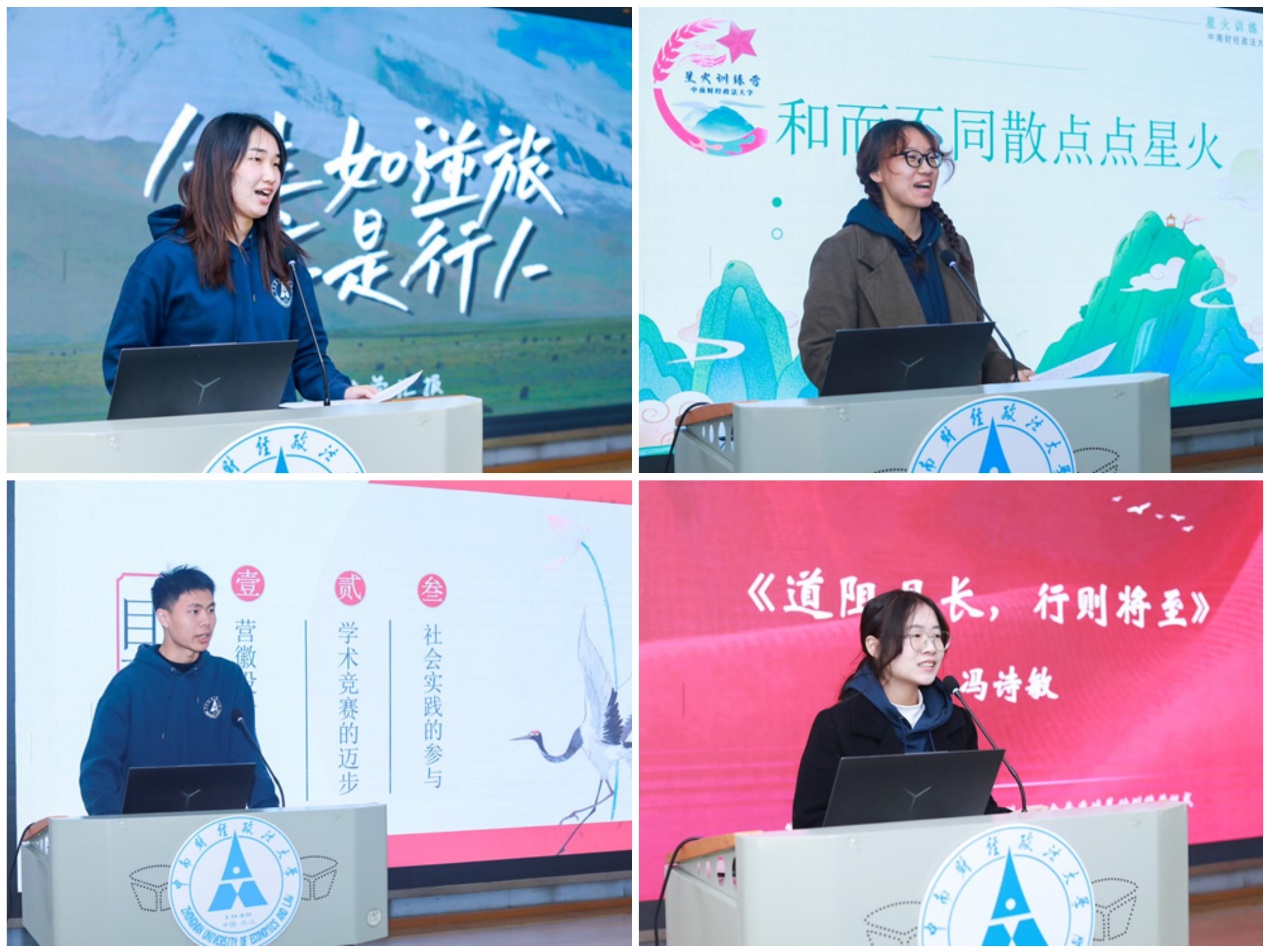 来自刑事司法学院的黄冠焱同学强调与来自不同院系的优秀学子相识、交流经验的重要性,并分享自己参与设计营徽和博文竞赛培训的经历与成长。在结尾部分,他感谢“星火训练营”给予的学习氛围和激励力量,即使课程结束,学习旅程也会持续,他会怀揣热爱知识的心继续前行。