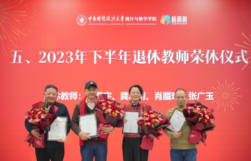 大会第四项,统计与数学学院为葛翔宇、龚承刚、肖腊珍、张广玉四位老师举办了荣休仪式,由学院新进教师向他们献花。