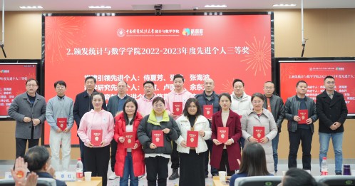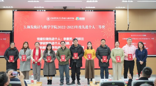 一段老师们带来的热情洋溢的舞蹈拉开了大会序幕。大会第一项,统计与数学学院党委书记梁娜宣读了《统计与数学学院关于表彰2022-2023年度优秀团队、先进个人的决定》。本次教职工综合表彰中,“统计学系党支部”等7个“优秀团队”、“杨皓”等30名“先进个人”受到表彰。校党委常委、副校长覃红,统计与数学学院党委书记梁娜,副院长常金华、杨青龙、王艳清,统计与数学学院党委副书记王瑄分别为获奖教师颁奖并合影留念。