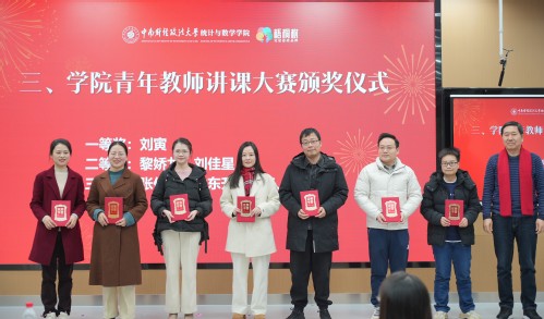 大会第二项,学院对青年教师讲课大赛的获奖教师予以表彰,刘寅、黎娇龙等7名老师获此殊荣,学院教学督导组组长、博士生导师李占风教授为他们颁奖并合影留念。