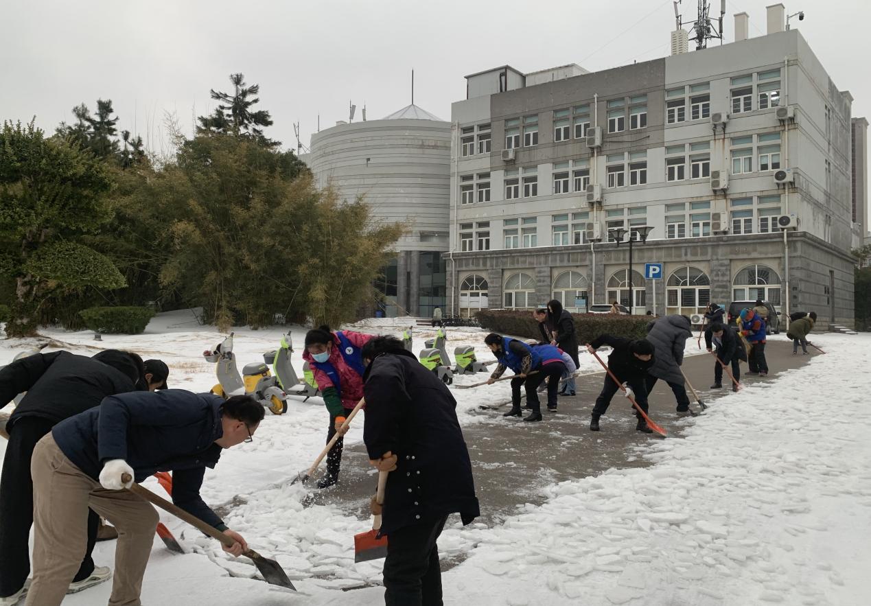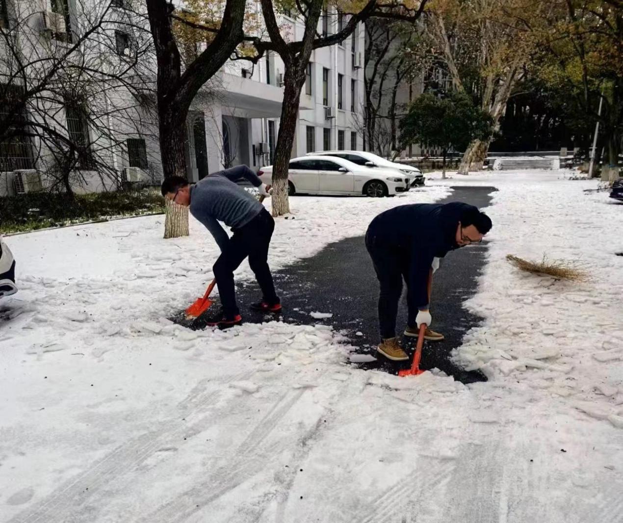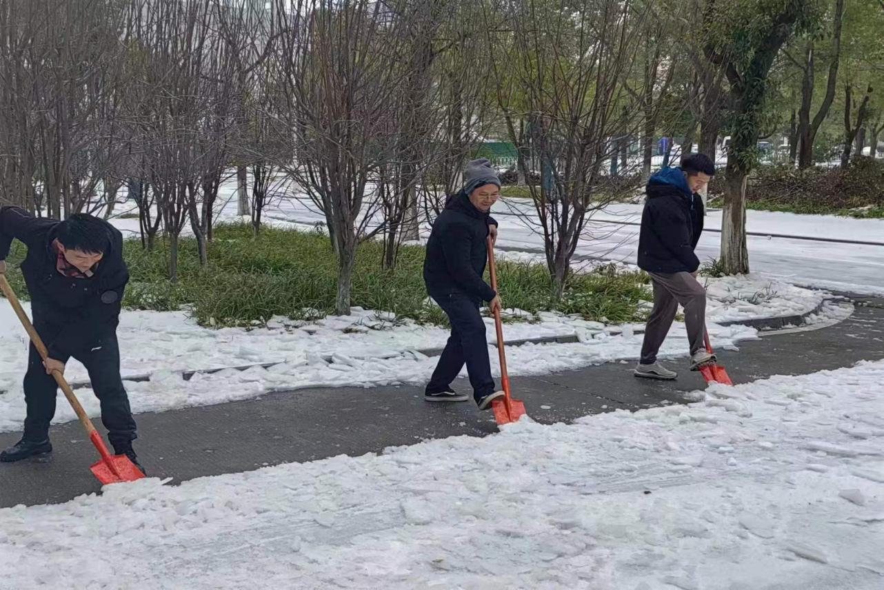 2月23、24日,教务部全体工作人员一大早就奋战在铲雪第一线,首义校区、南湖校区主干道、楼前楼后、小路台阶、书库前后……大家分工明确,配合默契,扛起铁锹、撸起袖子加油干。寒风瑟瑟,除雪工作固然艰巨,但大家齐心协力将路面冰层敲碎铲起堆放路边,在教学楼前铺上防滑垫,为师生们铲出了一条条“暖心路”。
