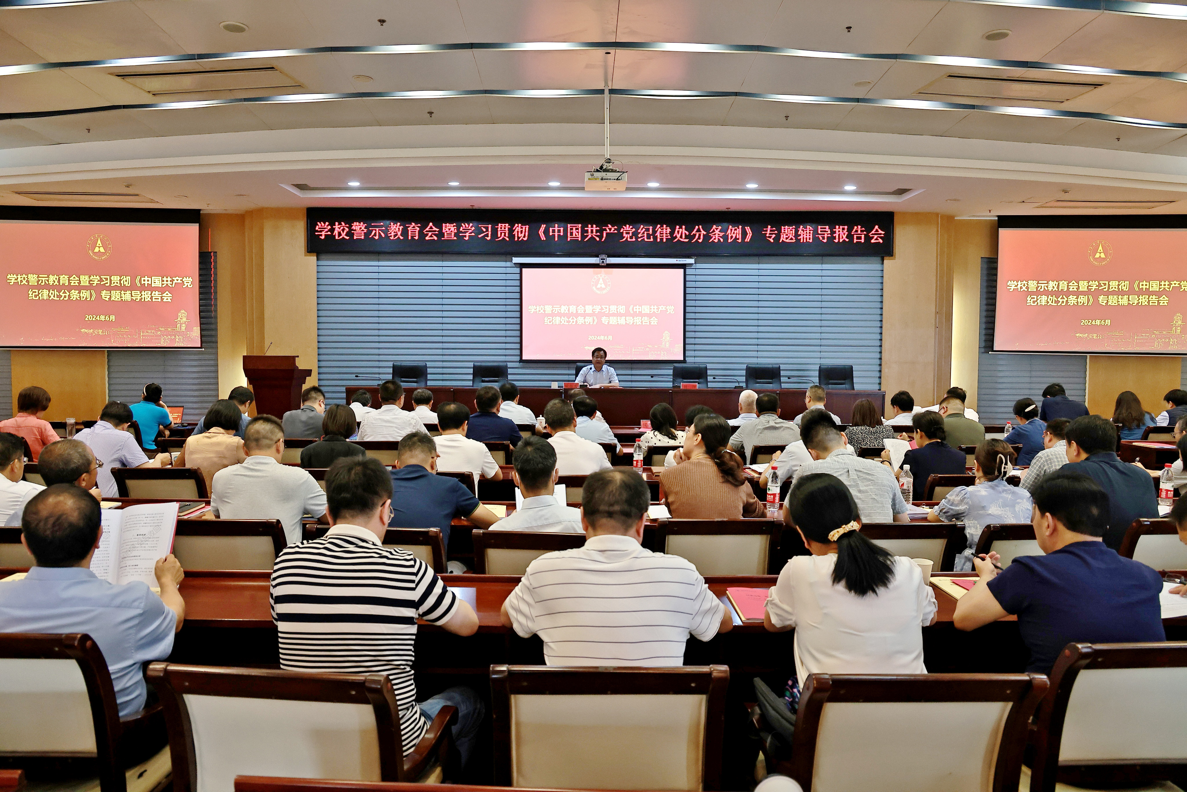 新闻网讯(通讯员 雷霆 摄影 杜鹏 崔桢桢 )6月17日,学校召开警示教育会暨学习贯彻《中国共产党纪律处分条例》专题辅导报告会。校党委书记侯振发主持会议并讲话。湖北省纪委监委第八监督检查室主任刘阳受邀为我校党员领导干部作党纪学习教育专题辅导报告。教育部直属高校党建工作联络员、校领导班子成员、中层正职领导干部,以及重点领域、重要岗位和关键环节相关单位中层副职领导干部参加会议。