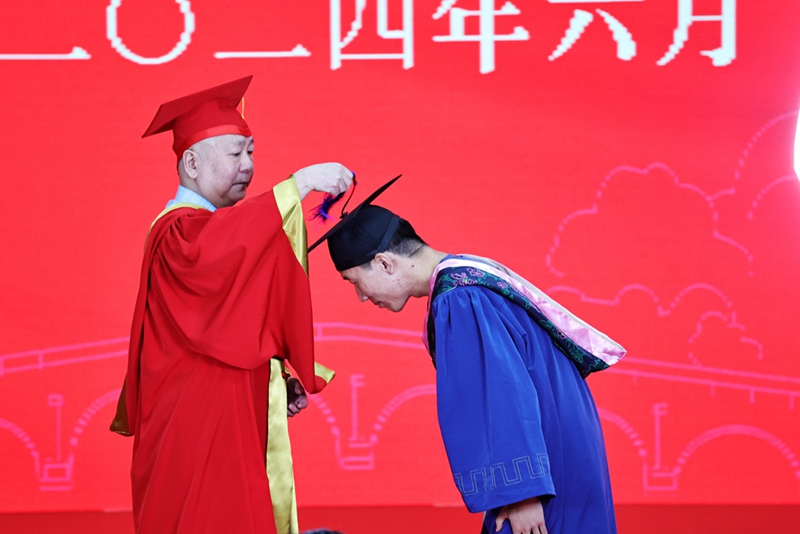典礼结束后,学位授予仪式现场举行。杨灿明为毕业生们拨穗正冠,颁发学位证书,并合影留念。