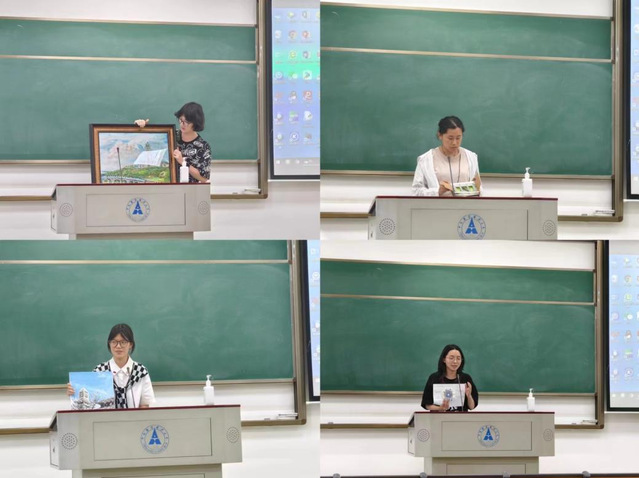 课堂上,同学们提交的绘画、书法、剪纸、摄影、手工等艺术作品在教室中同步展出,现场俨然成为小型艺术作品展览。同学们在充满美学氛围的环境中,逐一分享创作思路、创作过程、作品内涵和心得体会。民商2105班的杜梓殷同学和投资2102班的万铭枫同学分别用摄影和绘画方式呈现了南湖落日美景,“在中南大,每个人都有专属的落日时分”的感慨引发大家的共鸣。注会2205班的柳宇轩用手绘折本的形式展现校园风景和校训精神,极具国风特色的设计吸引了大家的目光。