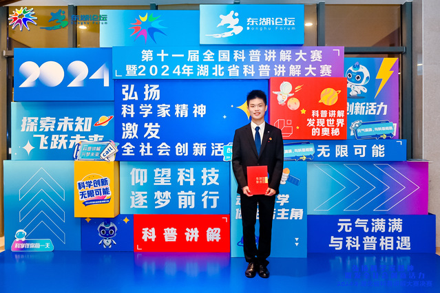 本次决赛以自主命题形式进行,我校选手徐凌喆以《气象卫星如何让风云可测?》为主题,生动形象的讲述了气象卫星如何通过精准动态监测和科学计算,使天气预报越来越准确;同时揭示了气象卫星不仅是日常生活的好助手,也是全球对地观测网中的主力军。他在舞台上的精彩讲解和面对提问的流利回答获得评委们的一致认可,最终以94.8分的优异成绩获得2024年湖北省科普讲解大赛三等奖!