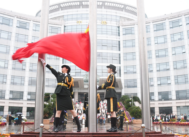 上午7:05,尽管气温骤降、寒风凛冽,升旗仪式仍准时开始。国旗护卫队迈着整齐划一的步伐将国旗护送至升旗台,擎旗手迎风振臂,有力地将国旗向空中展开,五星红旗在蒙蒙细雨中缓缓升起,迎风飘扬。