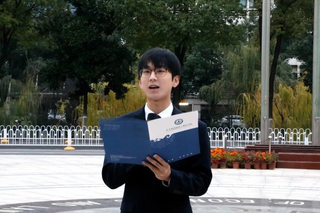 法学院2021级本科生代表孙柏堃同学在国旗下以《探索法科学子的多种可能》为题发言,讲述他怀揣对法学的热爱,和团队成员一起积极投身科研创新勇夺第十八届“挑战杯”全国二等奖、社会实践普法宣传反哺乡村、创业实践助力企业获得千万级融资,将小我融入大我的奋斗故事。