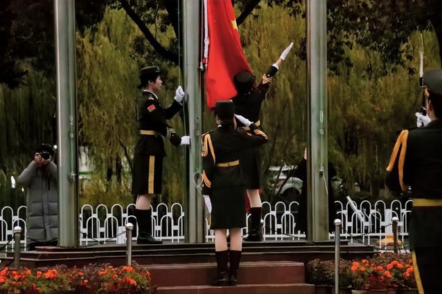 上午7时,伴着红日微光,升旗仪式正式开始。迎着朝阳,国旗护卫队迈着整齐划一、铿锵有力的步伐护送五星红旗入场。伴随着雄壮嘹亮的《义勇军进行曲》,鲜红的五星红旗冉冉升起。全体师生肃然起敬,庄严面向国旗行注目礼。