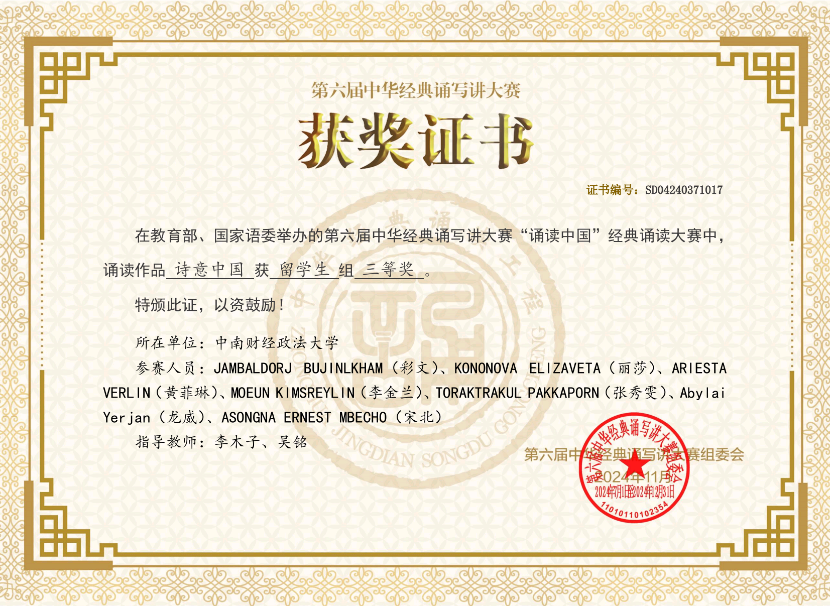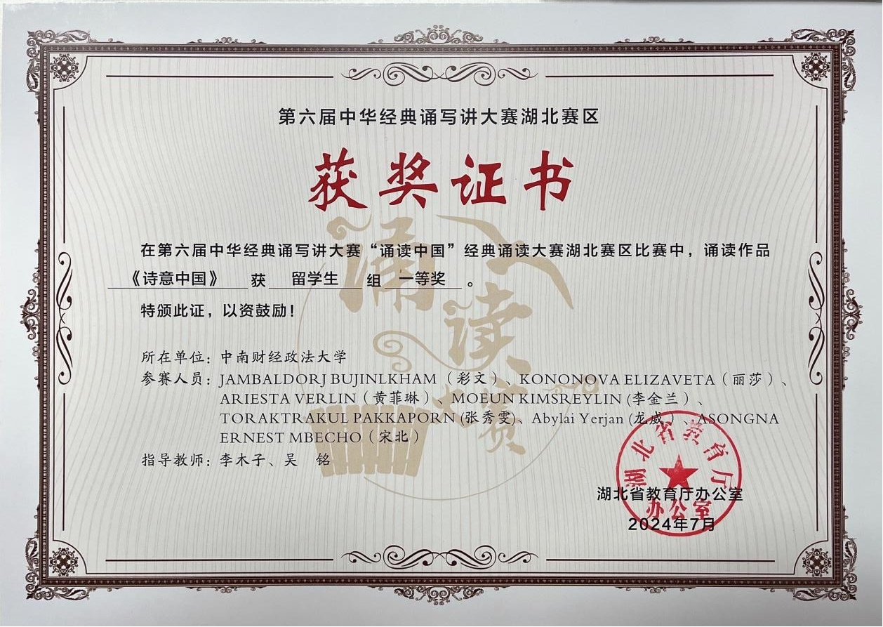 新闻网讯(通讯员 李家琪 李木子)近日,由教育部与国家语言文字工作委员会联合举办的第六届中华经典诵写讲大赛“诵读中国”经典诵读大赛结果正式公布,我校国际学生代表队喜获全国三等奖。