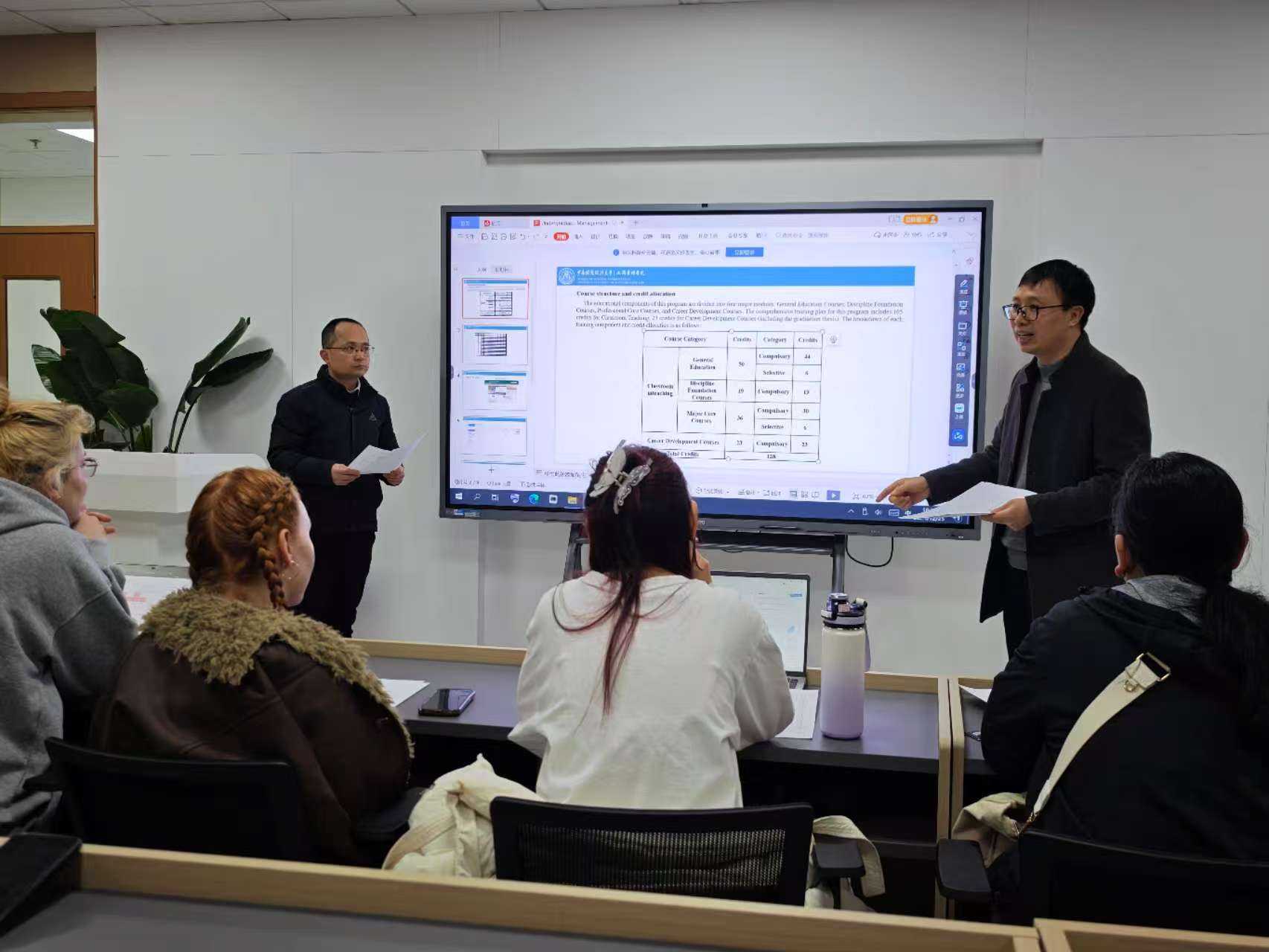 学期末,班主任董慈蔚、教学秘书吴诗荣、辅导员刘振兴指导留学生们进行新学期选课,并且结合培养方案、过去一学期的学习生活等开展交流,并听取同学们的意见和建议,氛围轻松,交流愉悦。