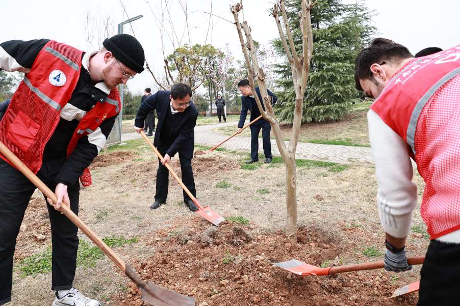 孟春时节,植树正兴。上午10时30分,植树现场一派生机盎然,新鲜的紫薇树苗准备就绪,师生三五成组,或挥锹铲土,或扶苗培土,或提桶浇水,大家齐心协力、相互配合,现场忙碌而有序,气氛十分热烈。特别是参与植树活动中有来自不同国家的同学,他们撸起袖管,干劲十足,看着亲手种下一棵棵树苗,每位同学都充满了劳动的乐趣和为校园添绿增彩的成就感。经过紧张忙碌的劳动,一株株紫薇昂然挺立、错落有致,在和煦的春风中焕发出勃勃生机。