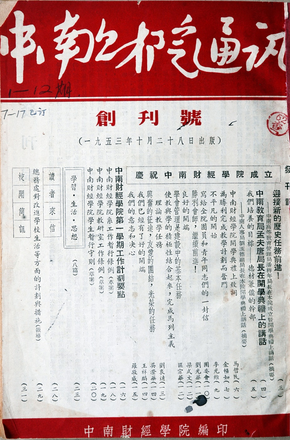 ▲中原大学首任副校长潘梓年的讲话《迎接新的历史任务前进》刊登于《中南财院通讯》创刊号