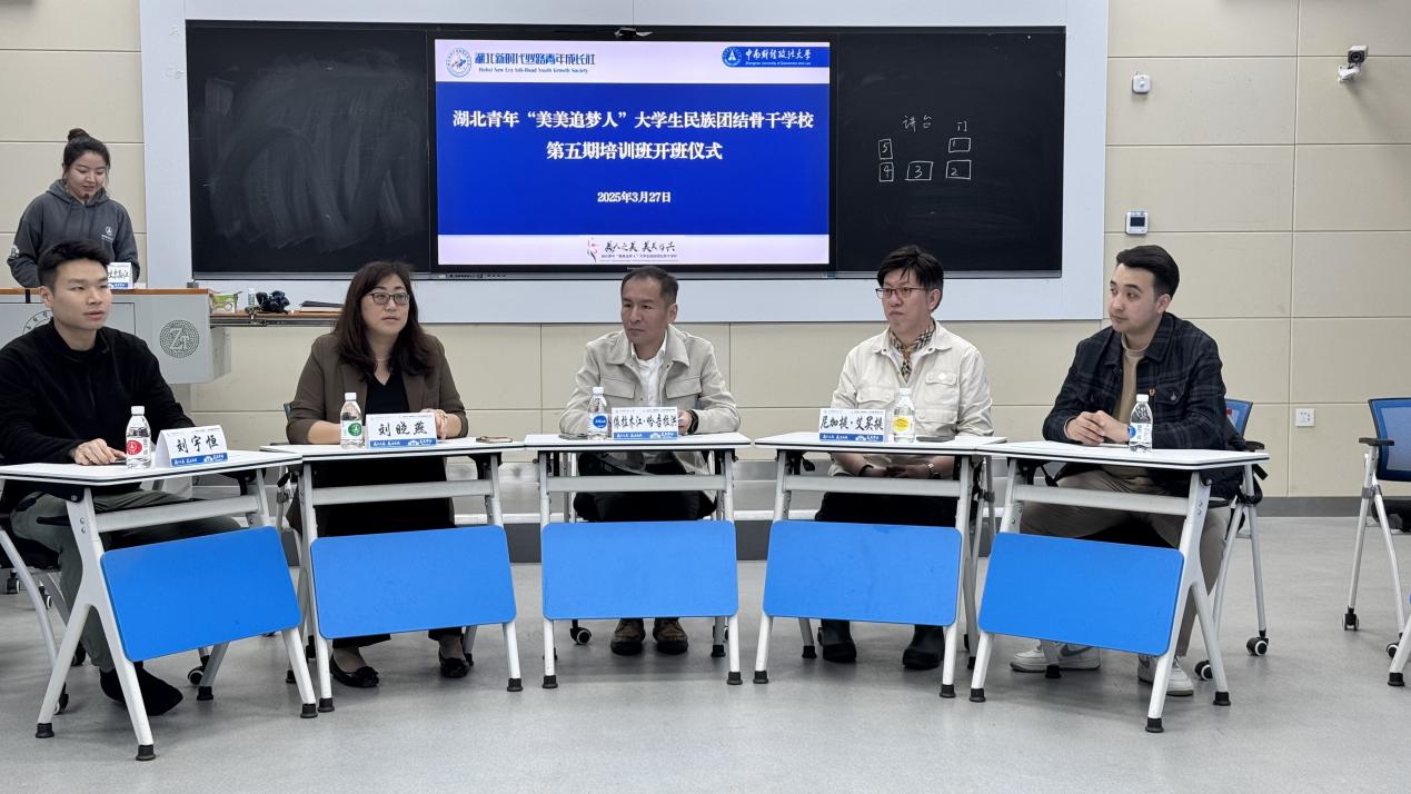 新闻网讯(通讯员 伊帕尔古丽 龚婷)3月27日,湖北青年“美美追梦人”大学生民族团结骨干学校第五期培训班在我校开班。湖北省民宗委协调处四级调研员、“全国五一劳动奖章”获得者依拉木江·哈吾拉洪,“美美中南”工作室指导教师、校医院党委书记刘晓燕,“美美中南”工作室主持人、工商管理学院党委副书记尼加提.艾买提,往届优秀学员代表刘宇恒及第五期全体学员参加活动,活动由骨干学校指导教师伊帕尔古丽主持。