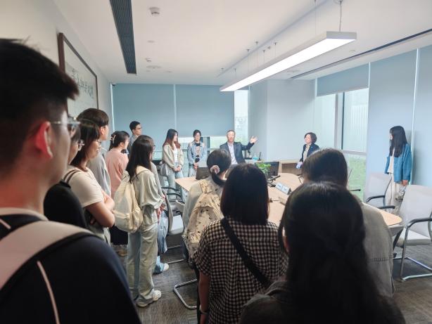 在武汉仲裁委员会办公室发展处负责人母洪春的引导下,师生们参观了武汉仲裁委员会总部的工作服务环境。母洪春处长详细介绍了仲裁委自1997年成立以来的发展历程,特别强调2021年总部迁址后形成的“一总部+四处办公场所”的布局。
