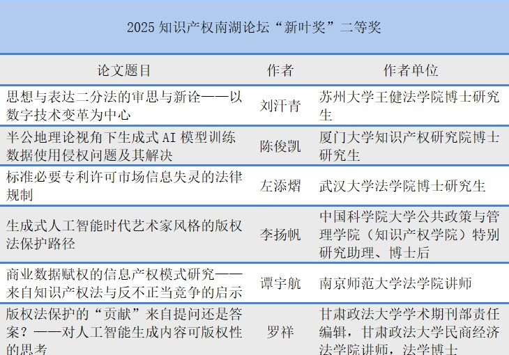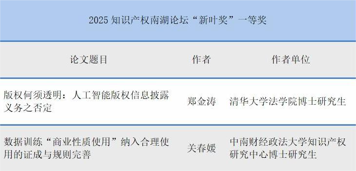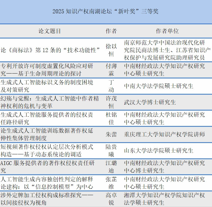 4月13日上午,在各分论坛代表作报告开展大会交流后,论坛举行闭幕式,会上公布了2025年知识产权南湖论坛“新叶奖”评选结果,并对获奖作者颁奖。