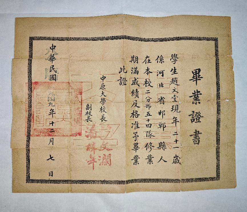 1949年12月,安娜的外公赵文堂从中原大学二分部五十四队毕业。这张特殊的毕业证书上,时间落款“中华民国”加盖了“公历一九四九年”的字样,具有中原大学在新中国成立后早期毕业证书的典型特征,承载着那个特殊历史时期的印记。