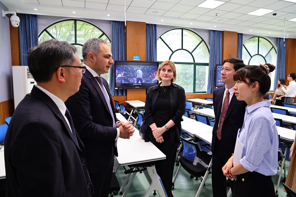 新闻网讯(记者 卓张鹏 摄影 杜鹏)5月14日,格鲁吉亚教育、科学和青年部部长亚历山大·图拉泽一行来校访问,实地考察华为-文华智慧教室示范中心,深入了解学校智慧教室和智慧教学的创新实践。格鲁吉亚驻华大使巴阿达·卡岚达泽,格鲁吉亚教育、科学和青年部副部长巴娅·克维茨亚尼、战略传播司司长玛丽亚姆·阿代什维利,驻华大使馆高级参赞媞娜婷·西西娜什维利和格鲁吉亚教育、科学和青年部礼宾事务负责人安娜·萨里什维利等陪同访问。校长、党委副书记朱方伟,校党委常委、副校长覃红热情迎接格鲁吉亚教育部代表团。覃红主持欢迎仪式。