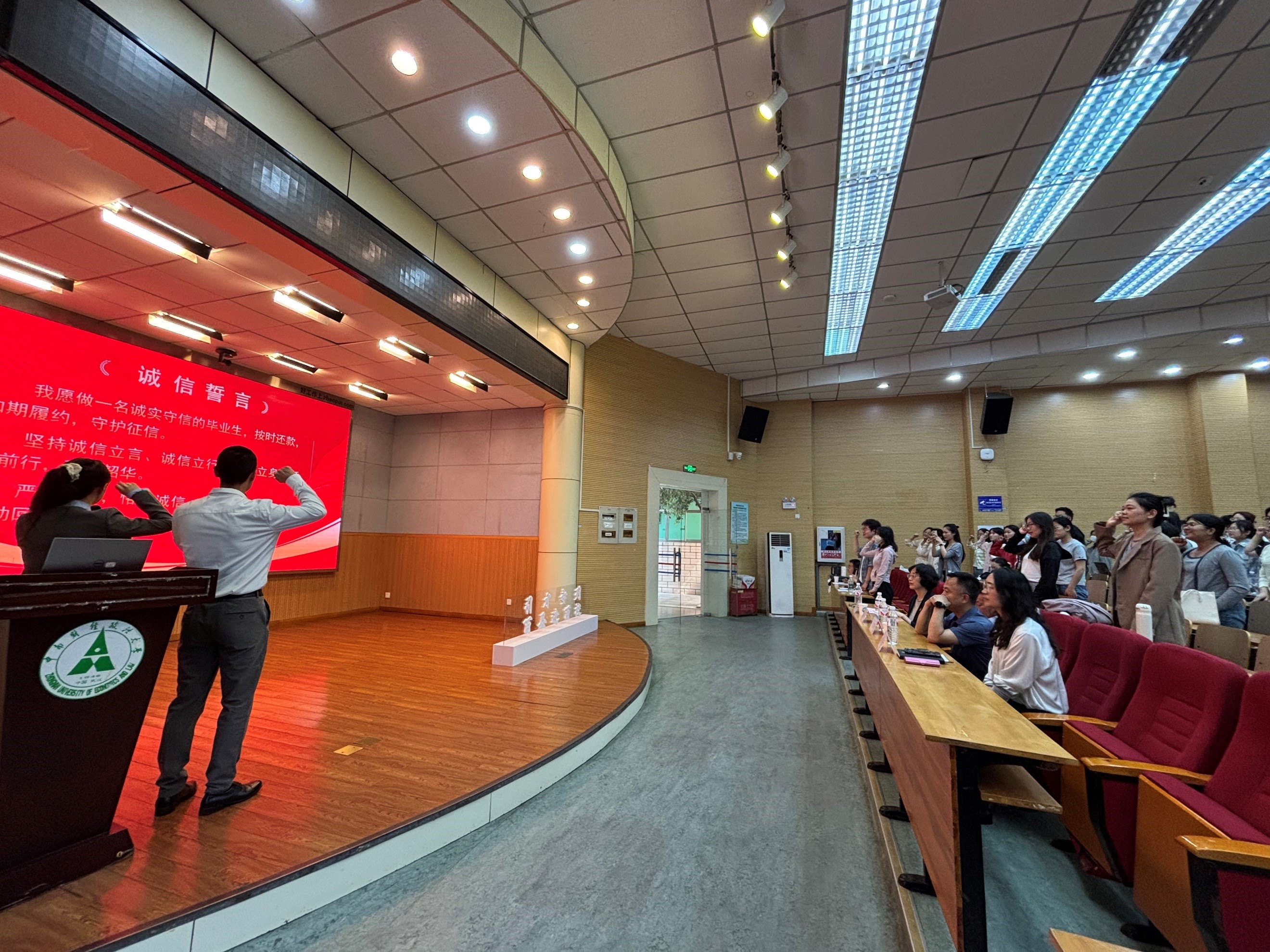 金融学院硕士生冉妮和刑事司法学院本科生拉元刚代表全体毕业生宣读诚信誓言,承诺按约还款,恪守诚信,感恩奉献,用实际行动回报社会,努力成为堪当强国建设、民族复兴重任的时代新人。