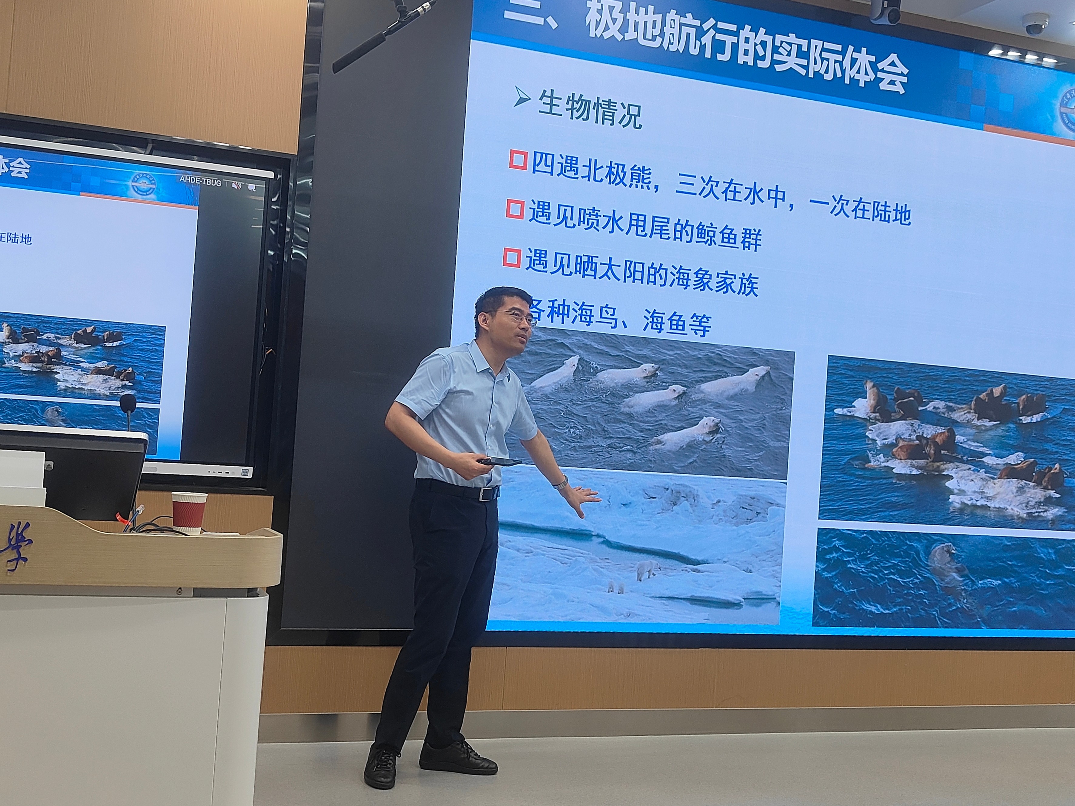 倪教授从南北极地理环境差异切入,引导学子思考极地生态特性与资源开发意义,指出极地船舶是人类探索极地的关键载体。他通过梳理从木质帆船到核动力破冰船的技术演进史,生动诠释了人类征服极地的科技突破过程。当谈及国内极地船舶的研究现状时,倪教授指出,当下,极地船舶研究正稳步推进,由中国自主建造的破冰船“雪龙2号”是全球首艘采用船首、船尾双向破冰技术的极地科考破冰船,具备强大的破冰能力。结合2018年北极科考经历,倪教授通过实拍的冰山、极光影像与生物观测记录,还原“天佑轮”在复杂冰情中的航行实况,让同学们身临其境。基于这些经历,他提出了要根据实际冰情灵活确定是否需要破冰船引航、要增强冰区航行船舶的操纵性能等思考。