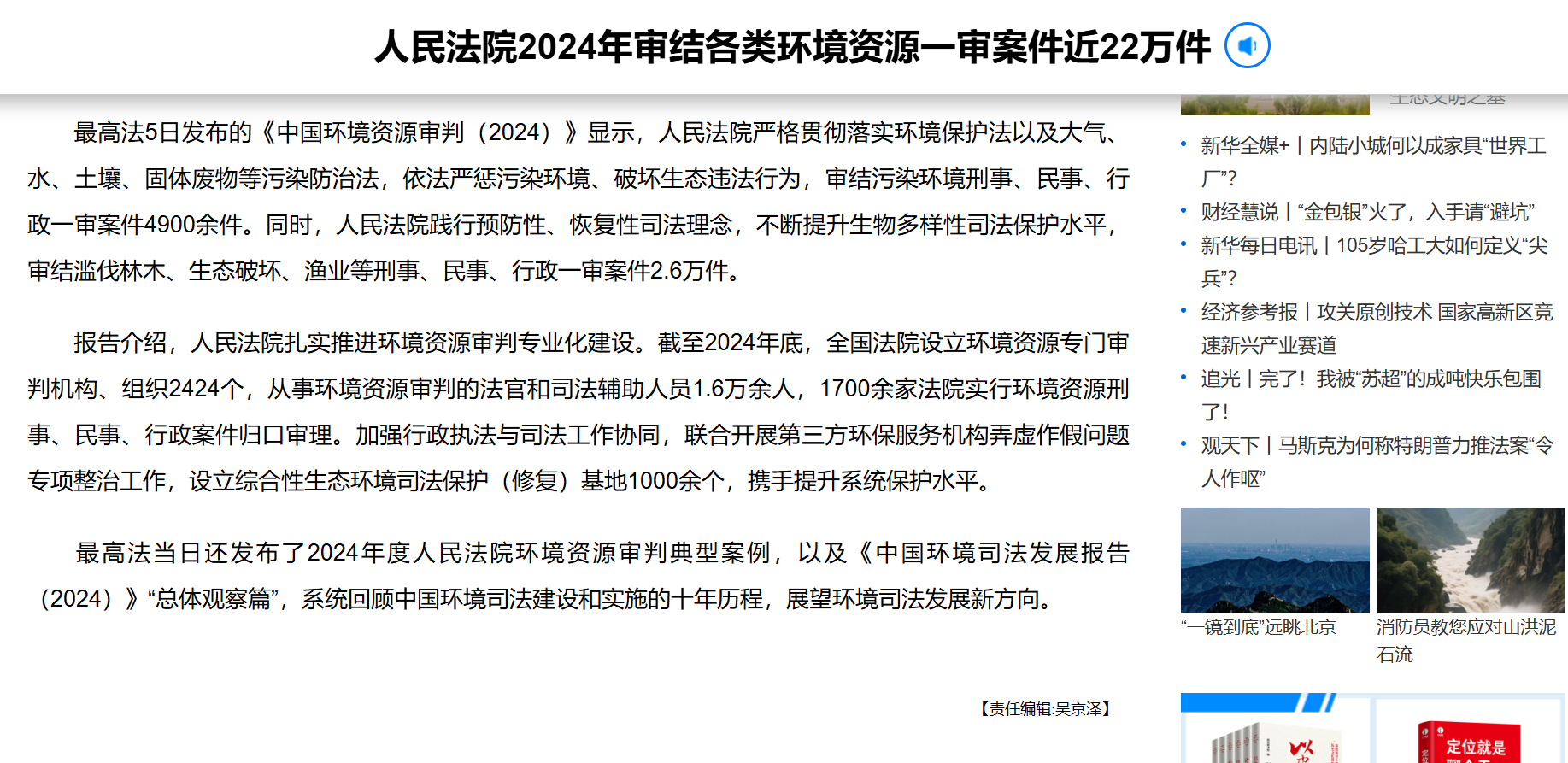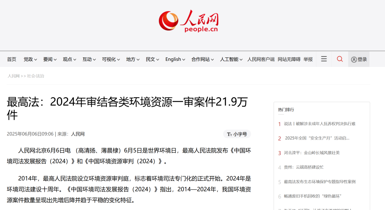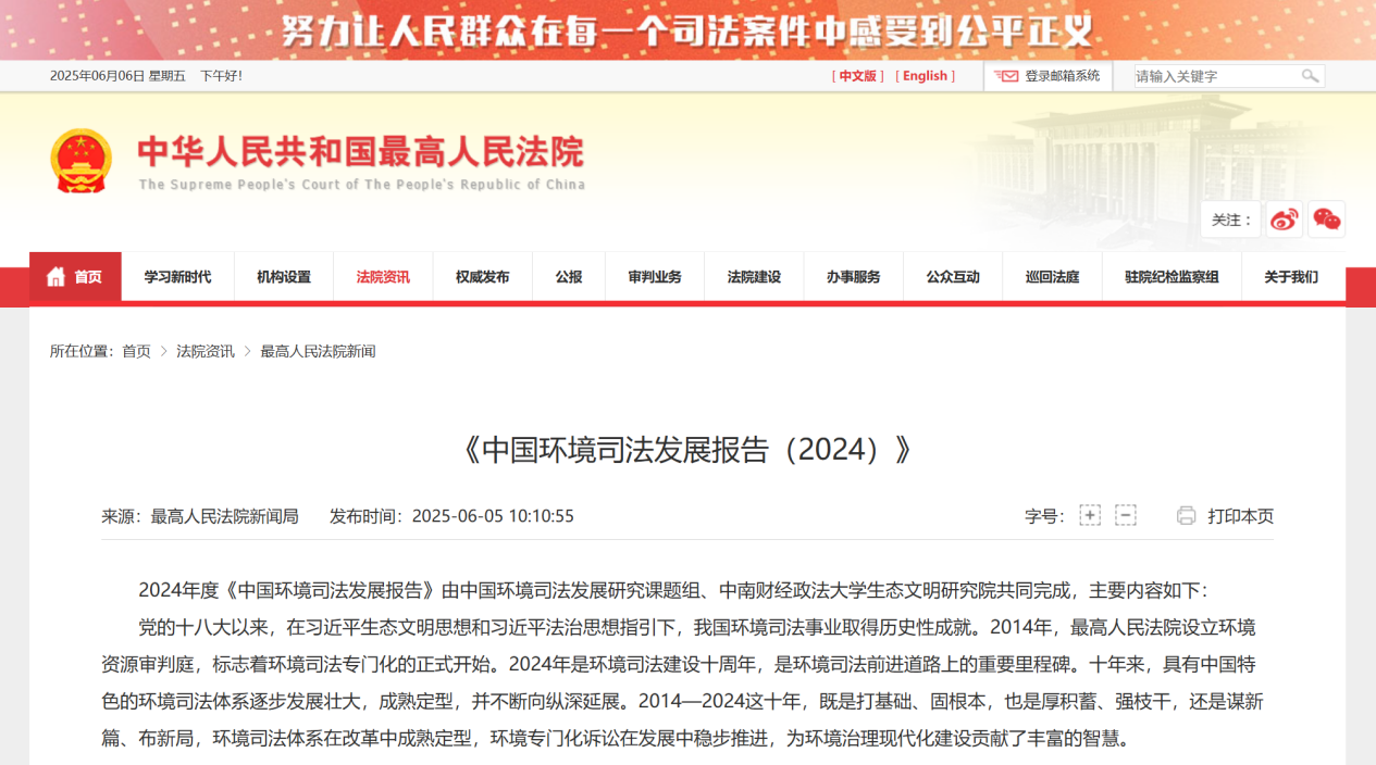 新闻网讯(通讯员 王耀珑)近期,最高人民法院正式发布了由“中国环境司法发展研究”课题组与米兰电竞·(中国区)生态文明研究院共同完成的《中国环境司法发展报告(2024年)》,系统回顾了十年以来中国环境司法建设与实施的绿色智慧及阶段性成就,为新时代中国生态环境治理的现代化进程贡献了宝贵的智识支持。报告内容与发布信息获得了人民网、新华网、中国环境网、中国新闻网等权威媒体的广泛报道。