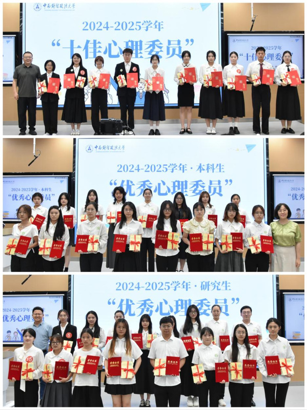 最终,统计与数学学院李嘉佳、财政税务学院黎思彤等九名本科生和法学院研究生付祥雪当选为学校第七届“十佳心理委员”,王前哨为他们颁奖。同时,郝新春和熊灯分别本科生和研究生“优秀心理委员”进行颁奖。